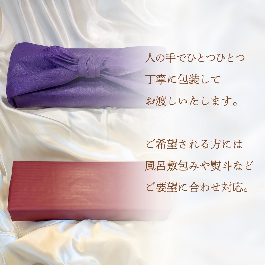 別途、風呂敷包みや紙袋をお付けする事も可能なので、ご相談ください。