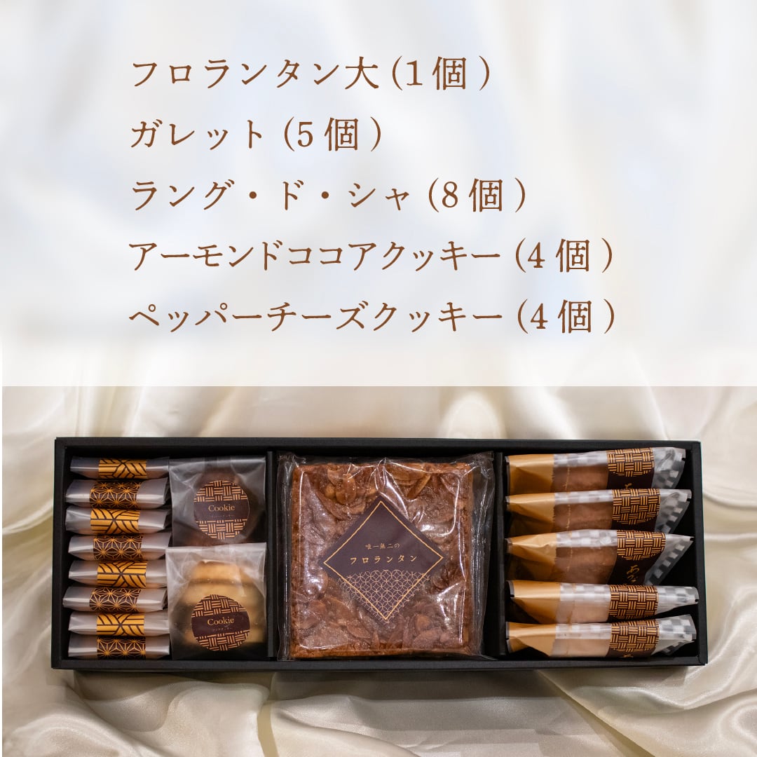 フロランタン(大)×1/ガレット×5/ラング・ド・シャ×8/ペッパーチーズクッキー×4/アーモンドココアクッキー×4